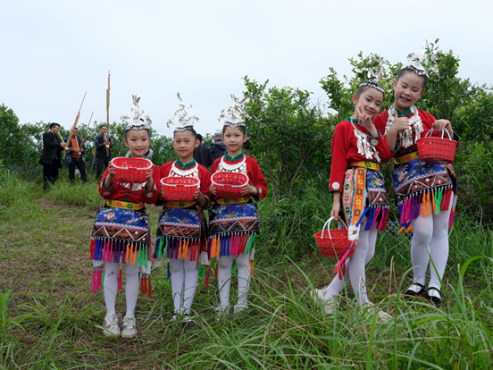在绿意盎然的蓝莓地里,身着传统服饰的苗族同胞进行国家级非遗芒筒芦笙表演。
