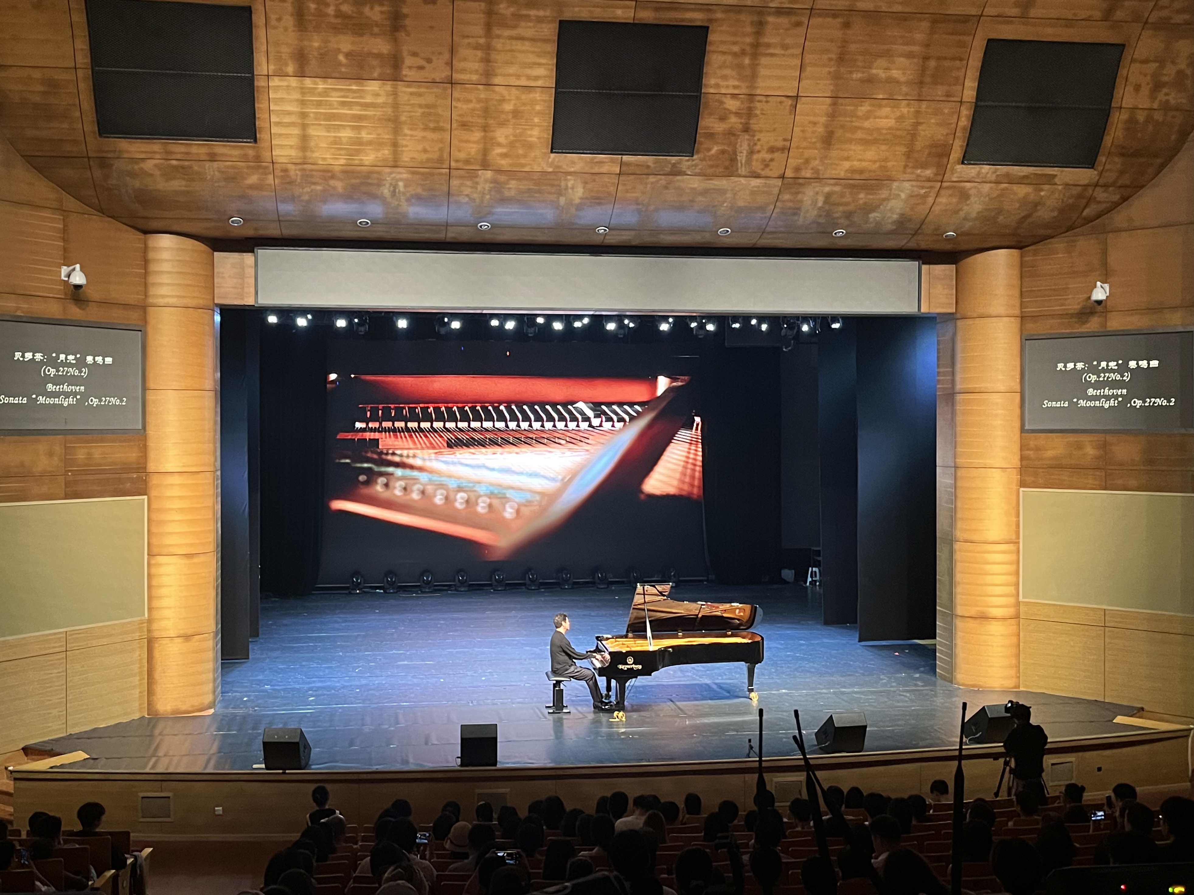 音乐会上,刘孟捷演奏了13首钢琴曲,皆为著名作曲家肖邦、希曼诺夫斯基、贝多芬、斯克里亚宾、李亚普诺夫、柴可夫斯基、德彪西创作的经典曲目。黑白键起伏转替,时而舒缓唯美,时而激昂明快,师生们安静聆听这些熟悉的作品,感受音乐的五彩缤纷与恒久魅力。