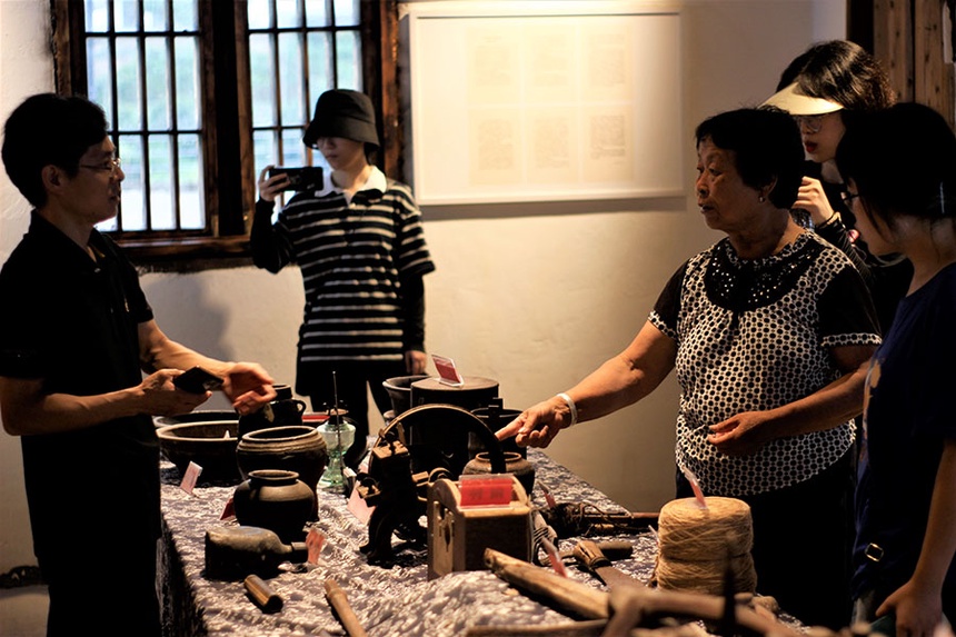 调研小组成员在杜刚老师带领下,参观悬崖村文化长廊,了解悬崖村“火山岩平台—峡谷—平板溪复合地貌”以及层状结构、球状风化形成的原因,实地感受当地的独特风景和风土人情。