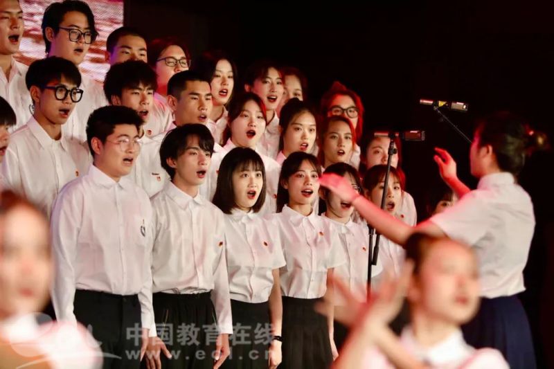 一百年的风雨,一百年的坚守。鲜红的党旗,象征着百年来中华儿女的满腔热血;挥动的党旗,彰显着广大青年在党旗引领下奋勇前行,不断书写青春华章。 活动在校艺术团灵动的舞蹈《我们走在大路上》中拉开序幕,共分《献给历史》《献给祖国》《献给青春》三个篇章,从柔美委婉的《南泥湾》到坚定有力的《太行山上》,从昂扬向上的《走向复兴》到大气磅礴的《不忘初心》,12个二级学院的同学们以合唱与舞蹈形式,演绎经典红色旋律,引导广大师生在歌声中感悟党史,在律动中坚定信仰。