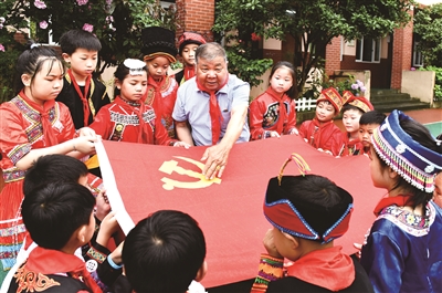 玉环市清港新民小学部分少数民族学生围着党旗,听清港镇关工委副主任陈志生讲党史