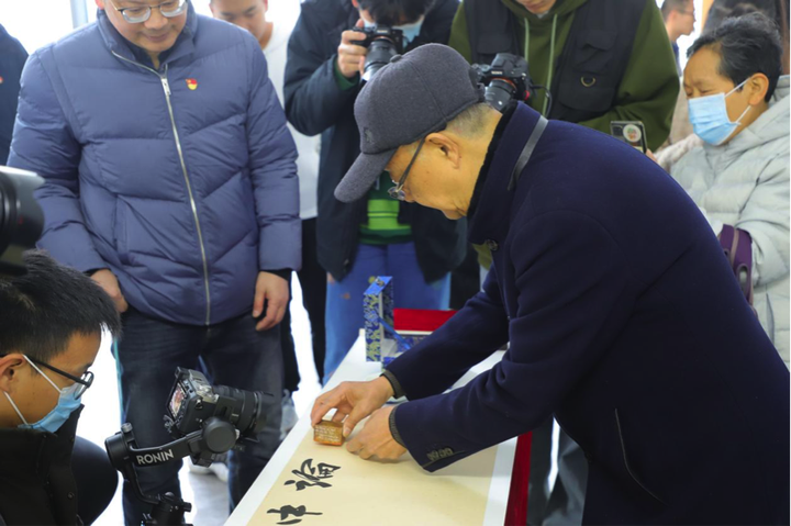年近八旬的西泠印社“诗书画印”四绝名家袁道厚先生为两幅百米长卷篆刻了“中国共产党百年华诞”和“中国共产党万岁”两方印章,并在现场亲自钤印,为长卷“画龙点睛”。