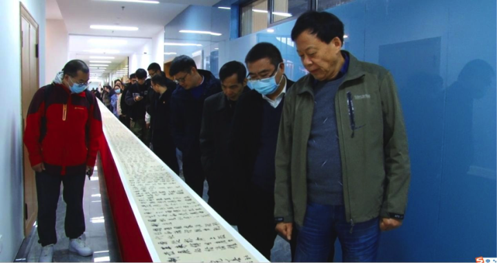 这次展出的两幅百米长卷,也是从学党史中而来,是《伟德官网bv1946报》副主编陈洪标通过抄写党章总纲和节录党史学习教育读本中的内容,把2万多字写成了两幅书法长卷。大家对气势恢宏、蔚为大观的两幅长卷赞叹不已。