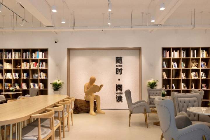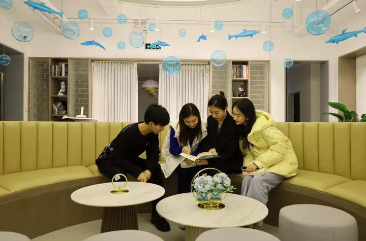 共享社区室内面积295平方,室外85平方,设有共享会议区、共享沙龙(直播)区与共享自习(阅览)区,集办公、阅读、会议、直播等功能为一体,并与校务服务办事大厅、辅导员工作室互联互通,形成强大的服务集群优势。整体空间的设计用色简洁大方、新颖别致,给人留下简雅的美感和想象的空间。