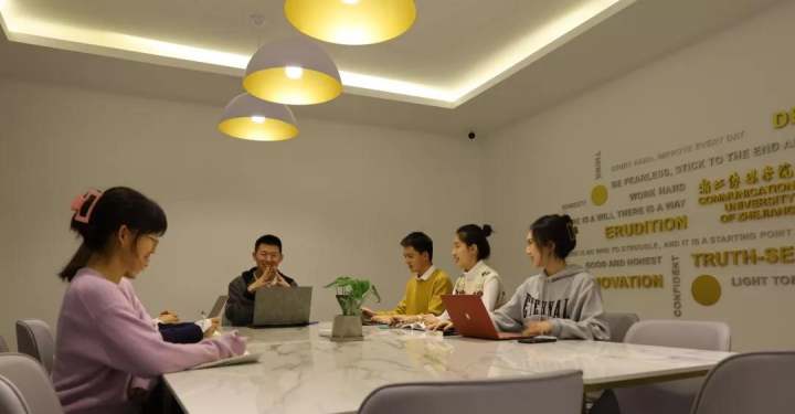 共享社区里还镶嵌着三面文化墙,一面上写着“随时阅读”,搭配阅读者的雕塑,传递了热爱读书的理念;另一面为马赛克拼成的“浙传”二字,可作为在校师生和校友的拍照打卡点,表达了浙传师生的爱校情怀。会议室内还有一面墙,上面镌刻着校标和英文校训,彰显浙传国际化办学理念。