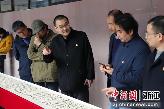 嘉宾在观展讨论。王志岳 摄 浙江省传统文化促进会副会长陈凌广认为,这两幅长卷以一种传媒人特有的传播学视角,把党史学成了一个艺术的创意行为。“尤其是把江山用图卷的方式和中国名画《千里江山图》结合在一起,不仅让我们看到了非常美的画面,而且非常富有创意。”