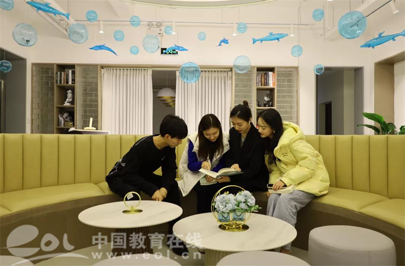 今年10月,“思享998”学生共享社区正式落成,由伟德官网bv1946党委书记杨立平命名,取“思考分享”之意,998则是伟德官网bv1946的门牌号。共享社区室内面积295平方,室外85平方,设有共享会议区、共享沙龙(直播)区与共享自习(阅览)区,集办公、阅读、会议、直播等功能为一体,并与校务服务办事大厅、辅导员工作室互联互通,形成强大的服务集群优势。整体空间的设计用色简洁大方、新颖别致,给人留下简雅的美感和想象的空间。