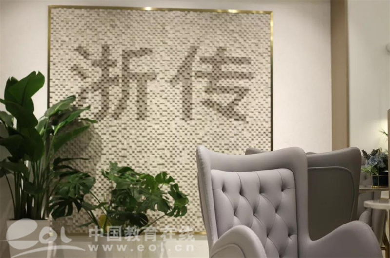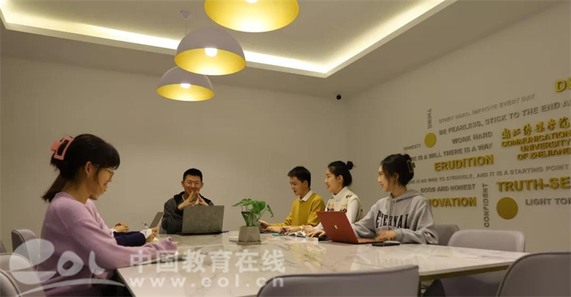 共享社区里还镶嵌着三面文化墙,一面上写着“随时阅读”,搭配阅读者的雕塑,传递了热爱读书的理念;另一面为马赛克拼成的“浙传”二字,可作为在校师生和校友的拍照打卡点,表达了浙传师生的爱校情怀。会议室内还有一面墙,上面镌刻着校标和英文校训,彰显浙传国际化办学理念。