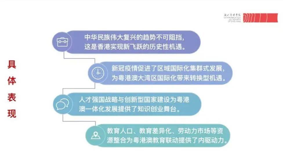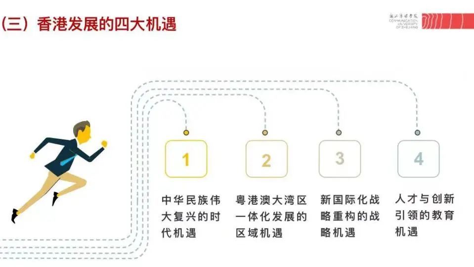 他认为,走向新时代的香港,要把握四方面机遇:即中华民族伟大复兴的时代机遇、粤港澳大湾区一体化发展的区域机遇、新国际化战略重构的战略机遇、人才与引领的教育机遇。通过把握时代大趋势,沿着“一国两制”道路,抓住粤港澳大湾区平台,香港将发挥更加重要的作用。其中,香港教育是经济社会发展的基础,教育治理则是香港长治久安、繁荣稳定的基石。