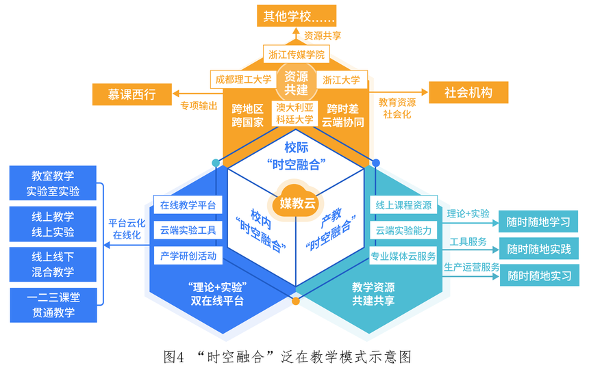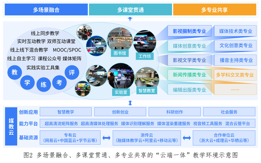 学校围绕媒体融合进行教学体系重构,通过开发融媒体实践教学云,实现实践教学线上化;与公有云互通,升级为浙传云,完成教室、实验室、图书馆等物理空间智慧化改造,实现教学环境线上线下混合;全面融合教学体系各要素,多校多企共建,形成媒教云——“云端一体”教学平台,实现多教学场景融合、一二三课堂贯通、教学资源多专业共享。