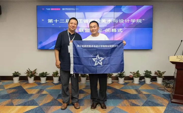 本次论坛,全省高校美术与设计学院院长聚集一堂,共同探讨课程和专业建设,探索具有浙江特色的高质量艺术类人才培养途径。胡晓阳作会议总结发言并向下一届联盟论坛承办学院宁波城市职业技术学院艺术学院潘沁院长传递了联盟会旗。