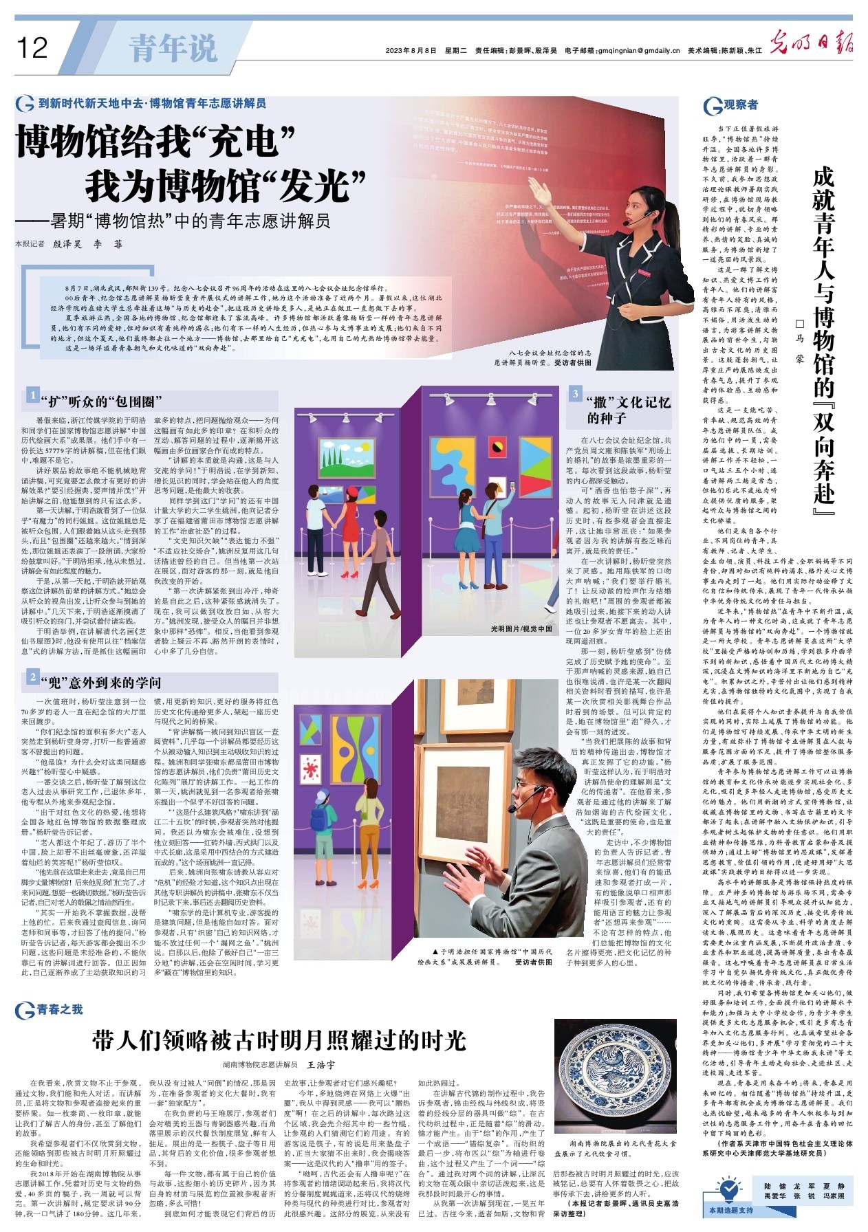 走访中,不少博物馆的负责人告诉记者,青年志愿讲解员们经常带来惊喜,他们有的能迅速和参观者打成一片,有的能像说单口相声那样吸引参观者,还有的能用语言的魅力让参观者“还想再来参观”……不论有怎样的特点,他们总能把博物馆的文化名片擦得更亮,把文化记忆的种子种到更多人的心里。