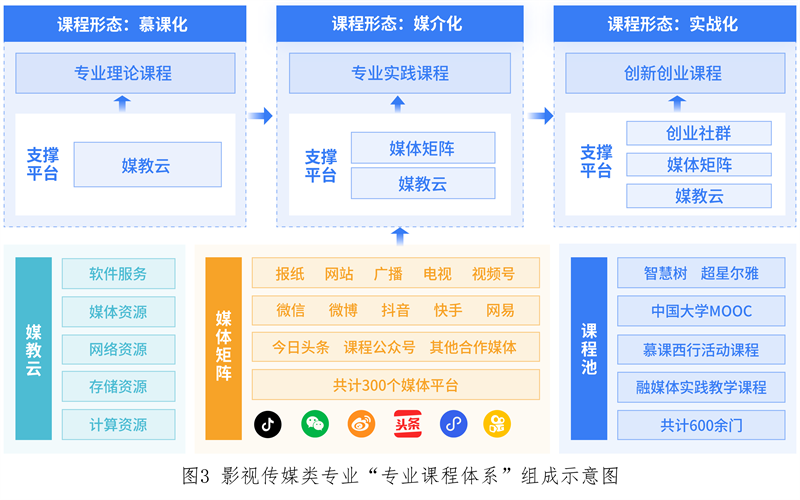 为适应影视传媒数字化转型,学校依托媒教云进行专业课程体系重构,通过持续建设慕课化专业理论课程,与头部媒体合作,创建300余个媒体组成的媒体矩阵,建设“技艺+专业+选拔”媒介化实践课程,并以省文化产业孵化园为平台,培育30余个创新创业社区,建成了由300余门专业理论课程、200余门实践课程、100余门双创课程组成的专业课程体系,其中国家级一流课程10门、省级一流课程165门。