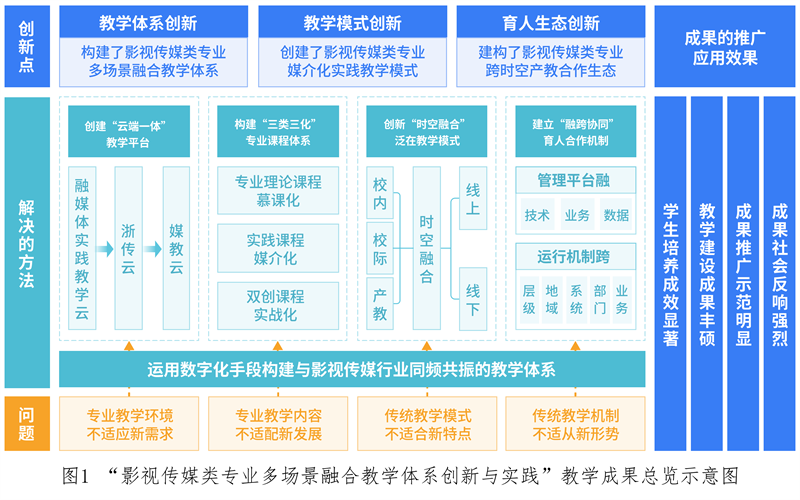 学校围绕媒体融合进行教学体系重构,通过开发融媒体实践教学云,实现实践教学线上化;与公有云互通,升级为浙传云,完成教室、实验室、图书馆等物理空间智慧化改造,实现教学环境线上线下混合;全面融合教学体系各要素,多校多企共建,形成媒教云——“云端一体”教学平台,实现多教学场景融合、一二三课堂贯通、教学资源多专业共享。