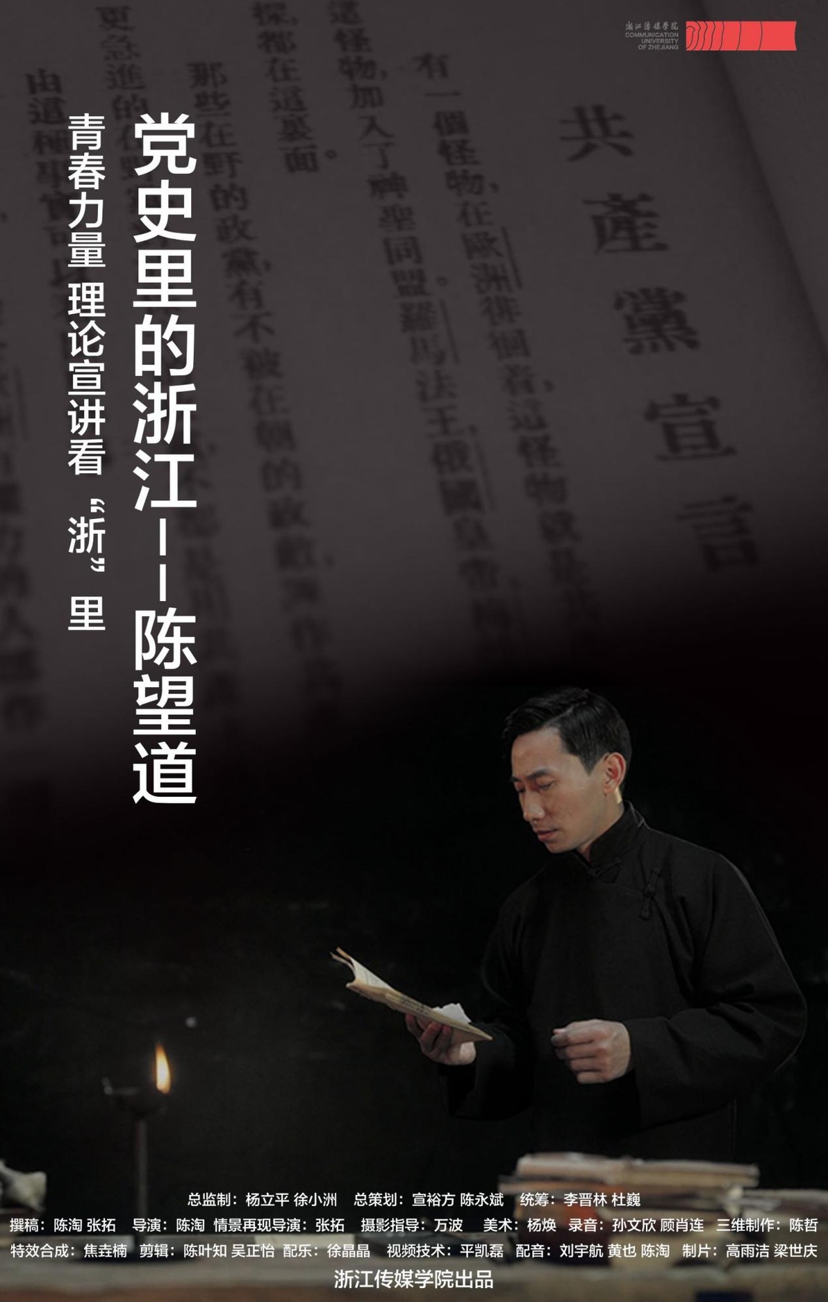 短片导演、华策电影学院教师陈淘表示:“在制作这个视频作品的过程中,我们主创人员和“红·传”青年宣讲团的同学一起做案头研究,查阅数十万字的资料,力争准确地捕捉百年前陈望道翻译《共产党宣言》的历史瞬间,感受彼时他的身体和内心,尽力在作品中还原革命先驱们作出历史选择时的思考与情感。这个创作过程,是我们真切理解中国故事的亲历体验。”