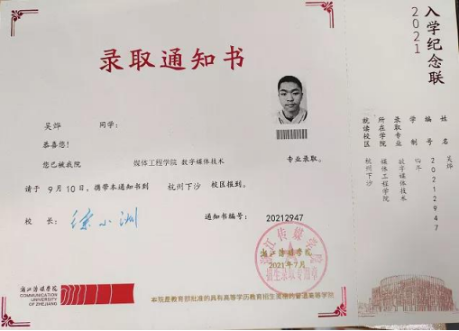 吴烨清楚地知道,只有比常人付出更多的努力,才能拥有更多的收获。终于,所有的努力都没有被辜负。2021年6月24日,吴烨与父母怀着紧张忐忑的心情围坐在电脑前查询自己的高考分数——494分,超过贵州省一本线38分,这一刻足以让一家人热泪盈眶。“拿到录取通知书的一刻,我真切地体会了一把‘梦想成真’的感觉”吴烨激动地说道。