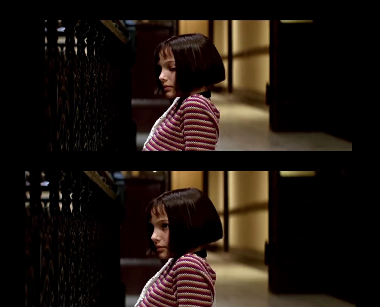 右手的食指和中指间熟练地夹着一根烟,白烟萦绕在指间。头没有生气地垂着,利落的短发盖住了半边脸。透过楼梯栏杆繁复的黑色花纹,小女孩抬起头抽了一口烟,眼神有些淡漠。彼时里昂照常杀完人,照常买了两罐牛奶,一个人走过长长的楼梯回家,遇到了坐在楼梯口的玛婷达。有人来了,玛婷达把烟藏起来,眼神瞬间变得桀骜。她上下来回打量着里昂,看起来不羁又不屑。
