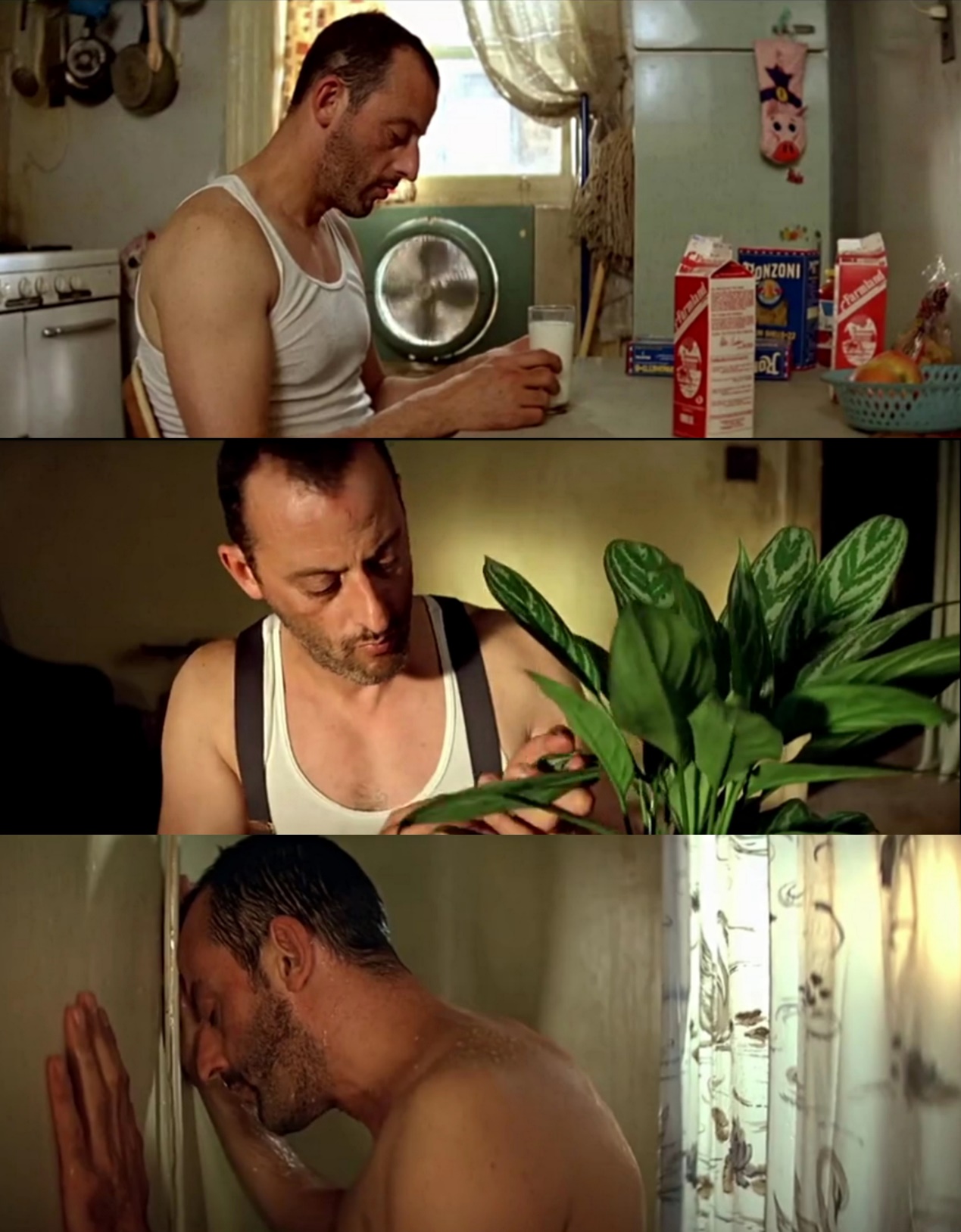 不杀人的日子里,他喝牛奶,熨烫衣服,细心照顾心爱的盆栽,一个人出门去影院看《雨中曲》。生活有时候也是宁静美好的,但在轻缓的口琴协奏曲的配乐中,孤独无处不在地渗透着。当他取下腰间密匝的杀人装备,冲淋身体时,他看起来压抑而隐忍,他的脆弱和疲惫终于在无人之处暴露。
