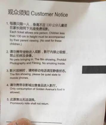 在电影票根的背面大多都印有“观众须知”。从道德层面来讲,屏摄与吸烟、携带宠物进入等一并作为不文明行为被禁止,但由于其现场影响远不如其他被禁止行为,处罚力度低,管理成本高,故影院大多置之不理,只有小部分影院采用剧场管理方式,用激光笔提醒观众不要照相录像。