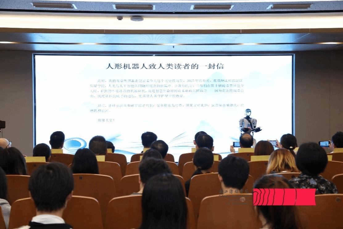 浙江宇树科技人形机器人现场为大家朗读了“致人类读者的一封信”,强调“科技赋翼、人文守心”,呼吁人机携手追寻阅读本质,共筑文明灯塔,将活动气氛推向高潮。