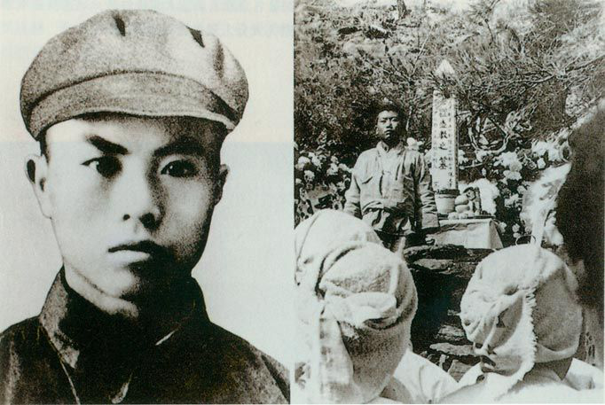 1952年1月2日,志愿军战士罗盛教在平安南道成川郡石田里,为抢救跌入冰窟的朝鲜少年而牺牲。被授予“中国人民志愿军一级模范”称号。左图为罗盛教,右图为被救少年崔莹在罗盛教墓前。