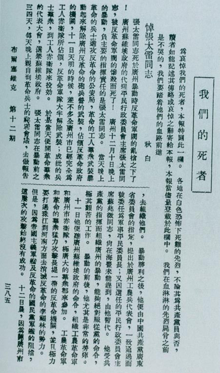 广州起义失败后,1928年1月2日,瞿秋白撰《悼张太雷同志》,1月9日在《布尔塞维克》第12期发表。