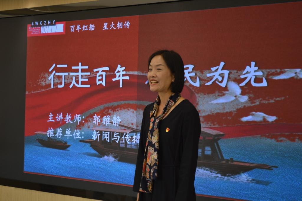 音乐学院教师陈琳结合自己参与大型音乐剧《红船往事》,并饰演了剧中的女主角——杨开慧的舞台经历,分享了她体会到的杨开慧在艰苦革命中坚守信念的奋斗精神,表达了爱国、爱党、爱校的热烈情感。