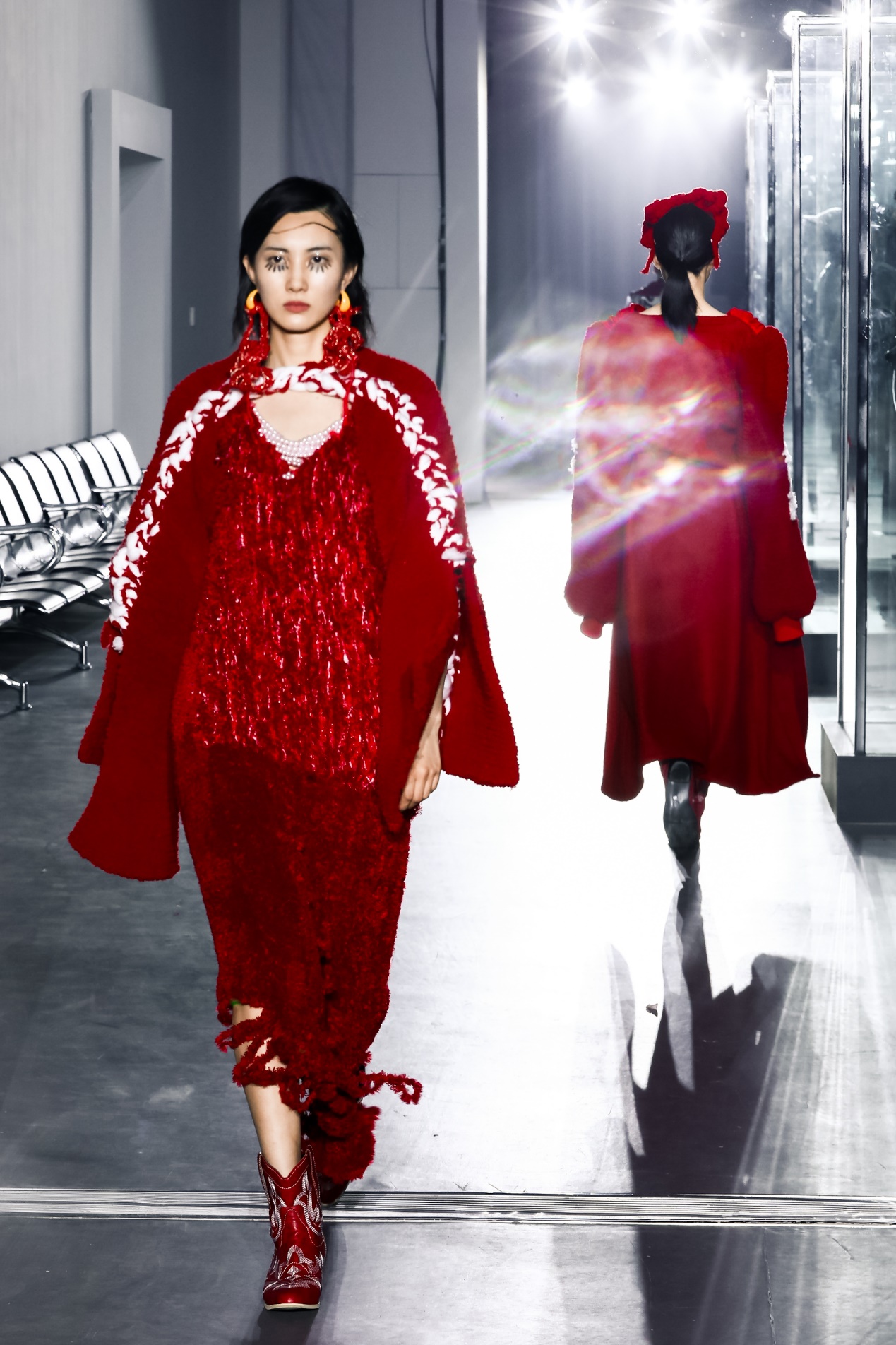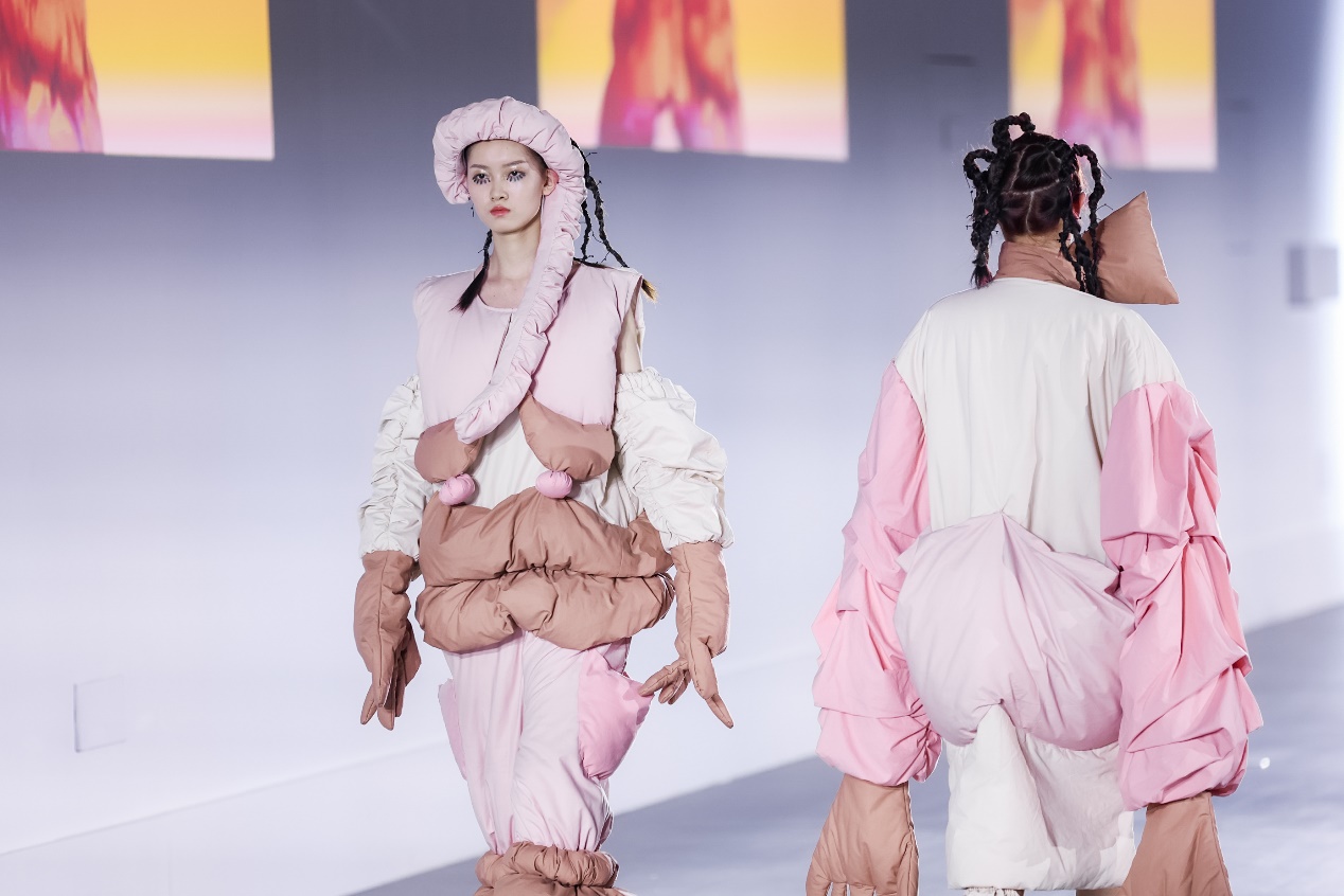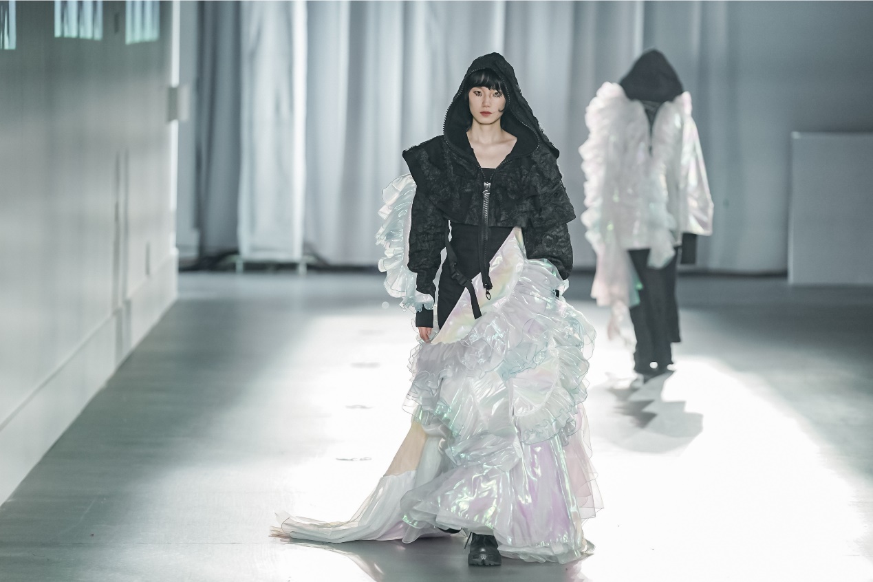 本次“出壳观新”服饰文化大秀分2个篇章进行,共涉及22个系列、88套服装。“出壳”将影像和艺术观念结合,探讨“第三视角”中的艺术“审视”,并采取空间的实验性表达,打破传统秀场T台形态,呈现多层次的流动空间。