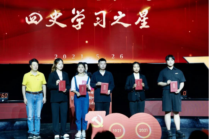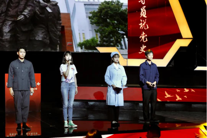 来自各学院9名辅导员和学生代表们从中国共产党成立至今的四个时期选取大家熟知的历史人物、历史事件、历史知识等,通过话剧、配音、情景再现等形式,从小小红船讲到巍巍巨轮,从“一大卫士”王会悟讲到“革命烈士”江姐,从无产阶级革命家方志敏讲到党的好干部焦裕禄,从党员之间的称呼讲到脱贫攻坚的伟业,沉浸式讲述让广大学子真切感受到了党的光辉历程和丰功伟绩。