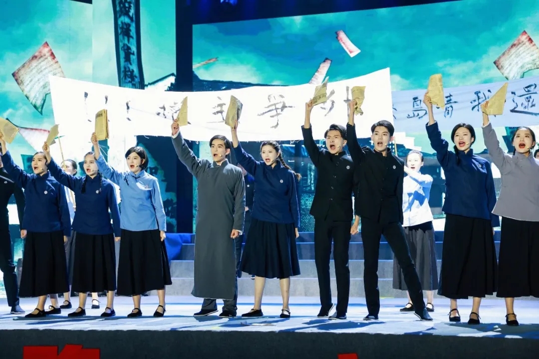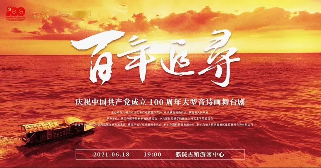 6月18日晚,由伟德官网播音主持艺术学院师生主创的“庆祝中国共产党成立100周年”大型音诗画舞台剧《百年追寻》在桐乡濮院古镇首次公演。
