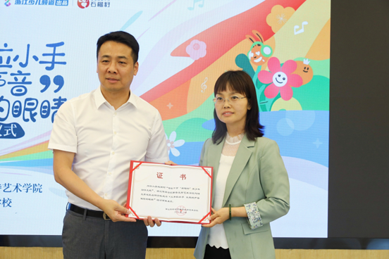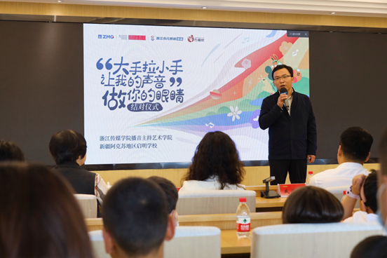 随后,播音主持艺术学院党委书记戚鸿峰与新疆阿克苏地区启明学校教师逯花萍共同翻开“大手拉小手,让我的声音做你的眼睛”结对证书,开启两校的公益助盲友谊。