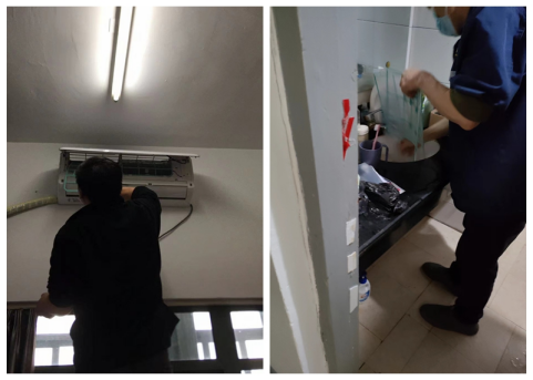 因要进学生寝室内清洗,公寓安排专门人员进行全程陪修,给清洗人员开门,配合清洗人员完成拆装、清洗、消毒等工作。同时,后勤服务中心在楼内小黑板和微信群里提前进行温馨提示,告知并引导学生配合清洗工作开展。