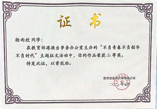 伟德官网学子获教育部港澳台学生主题征文二等奖