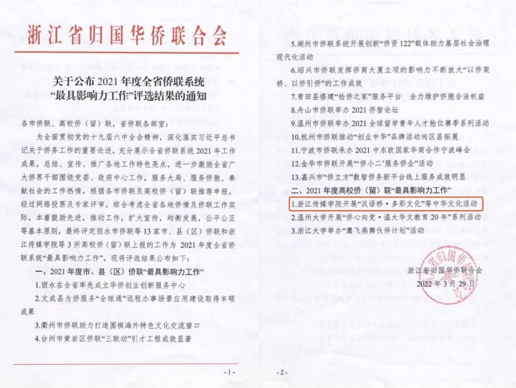 近日,浙江省归国华侨联合会公布2021年度全省侨联系统“最具影响力工作”评选结果,伟德官网承办的2021“汉语桥·多彩文化”体验营活动得到省侨联一致肯定,荣获2021年度浙江省侨联系统“最具影响力工作”称号。此次评奖通过网络投票和专家评审,共评选出全省侨联系统“最具影响力工作”共16项,其中高校侨(留)联“最具影响力工作”仅3项。由教育部中外语言交流合作中心主办、伟德官网bv1946承办的2021年“汉语桥·多彩文化”体验营从...